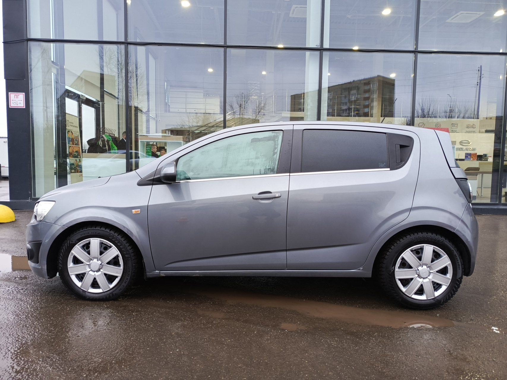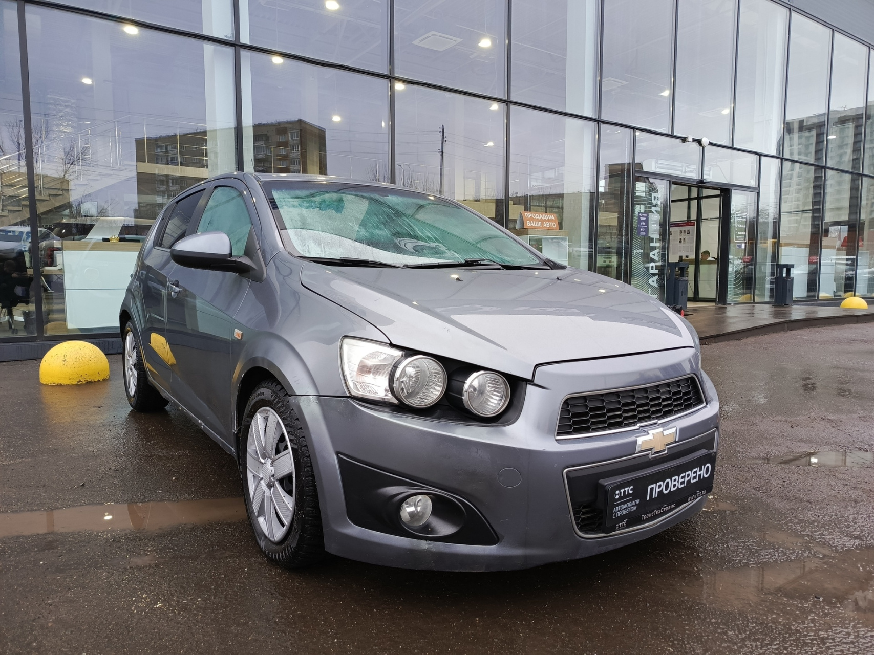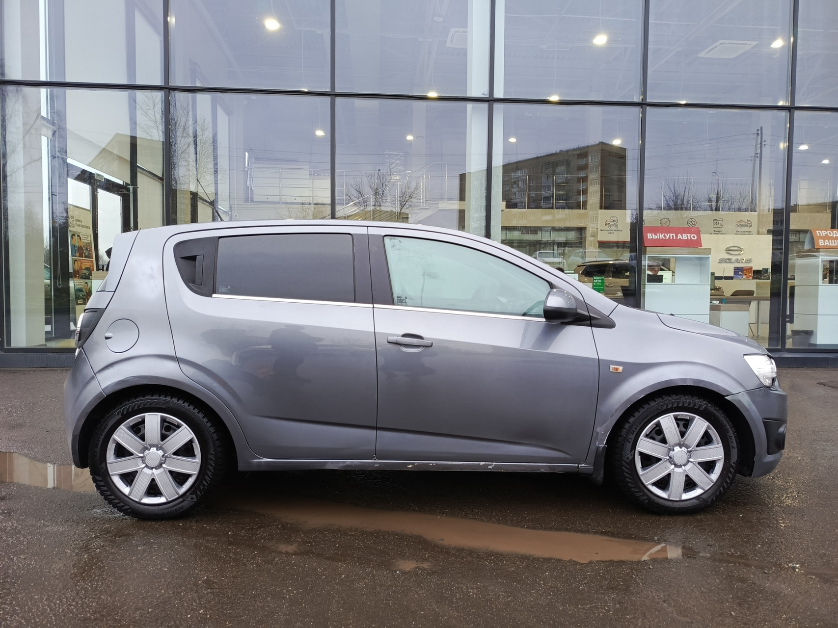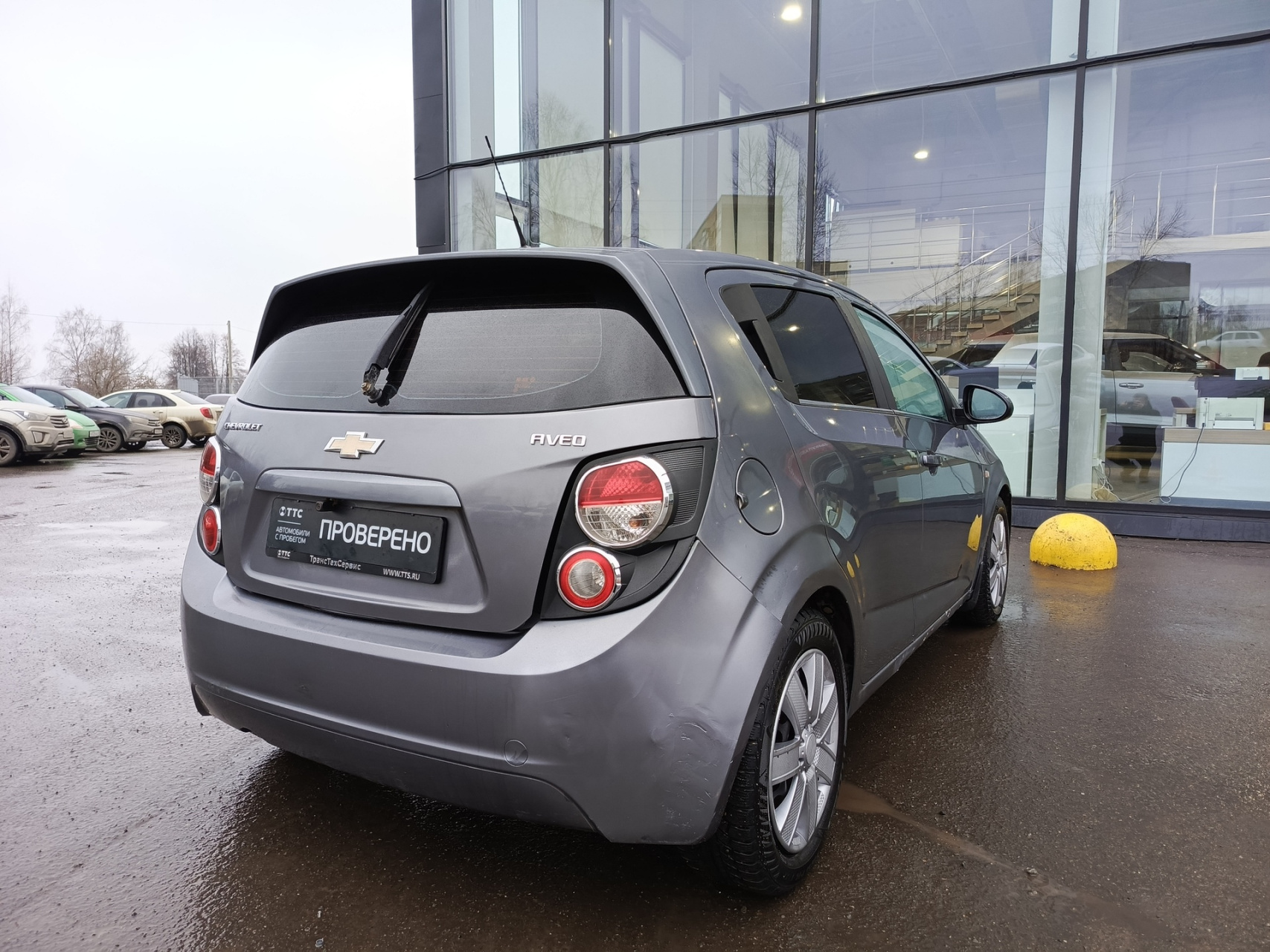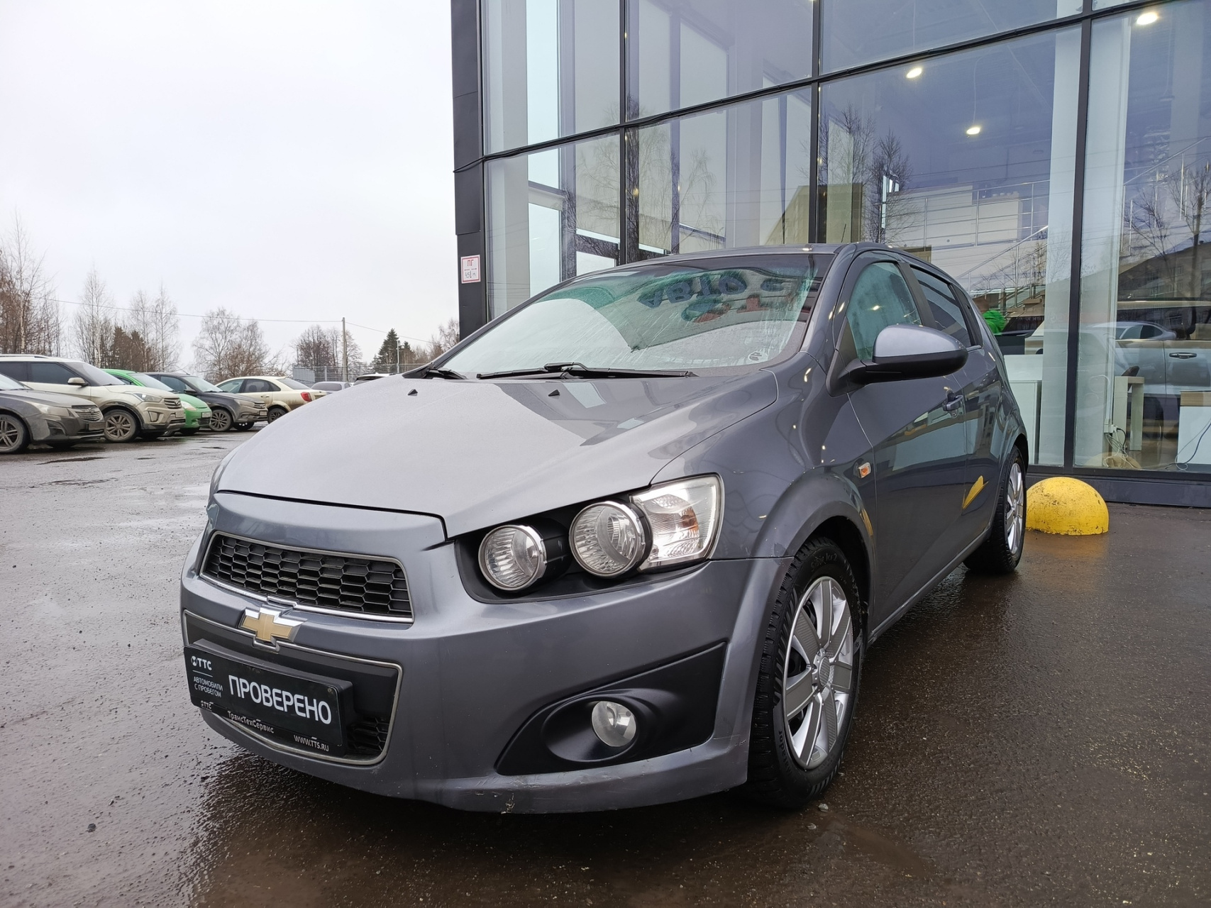 Chevrolet Aveo II, 2013 года выпуска, который представляет собой пятидверный серый хэтчбек.